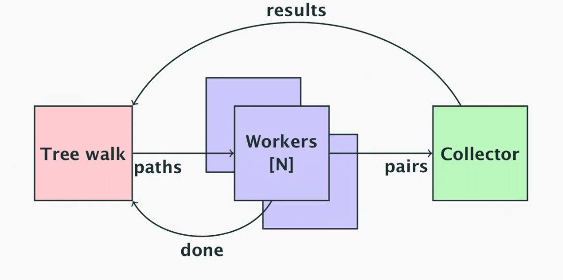 func worker(paths <-chan string, pairs chan<- pair, done chan<- bool) {